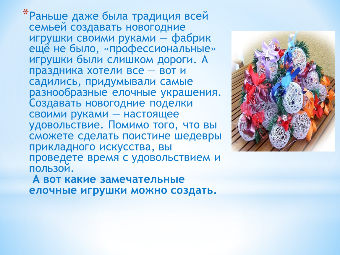 Раньше даже была традиция всей семьей создавать новогодние игрушки своими руками — фабрик ещё не было, «профессиональные» игрушки были слишком дороги. А праздника хотели все — вот и садились, придумывали самые разнообразные елочные украшения.Создавать новогодние поделки своими руками — настоящее удовольствие. Помимо того, что вы сможете сделать поистине шедевры прикладного искусства, вы проведете время с удовольствием и пользой. А вот какие замечательные елочные игрушки можно создать.