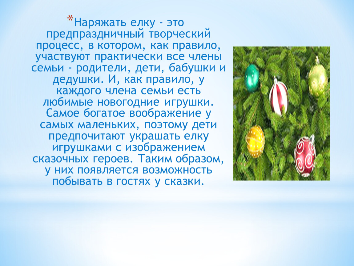 Наряжать елку - это предпраздничный творческий процесс, в котором, как правило, участвуют практически все члены семьи - родители, дети, бабушки и дедушки. И, как правило, у каждого члена семьи есть любимые новогодние игрушки. Самое богатое воображение у самых маленьких, поэтому дети предпочитают украшать елку игрушками с изображением сказочных героев. Таким образом, у них появляется возможность побывать в гостях у сказки.