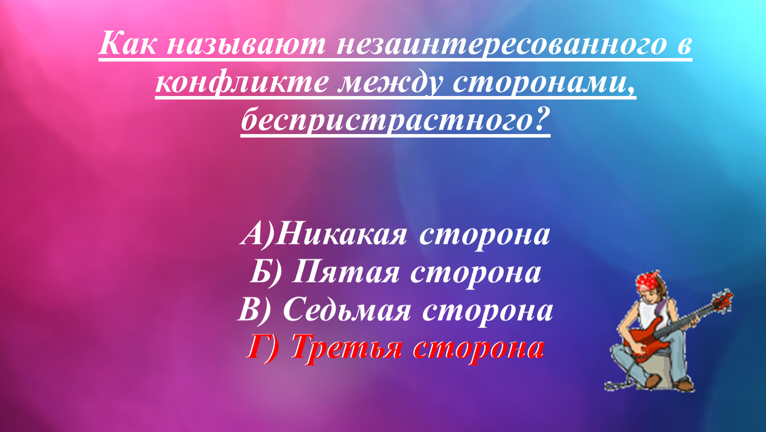 Как называют незаинтересованного в конфликте между сторонами, беспристрастного?А)Никакая сторонаБ) Пятая сторона В) Седьмая сторона Г) Третья сторона