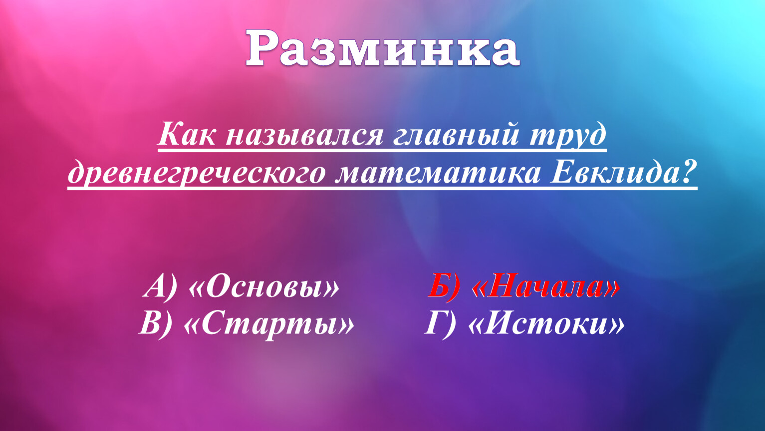 Как назывался главный труд древнегреческого математика Евклида?А) «Основы» Б) «Начала» В) «Старты» Г) «Истоки»