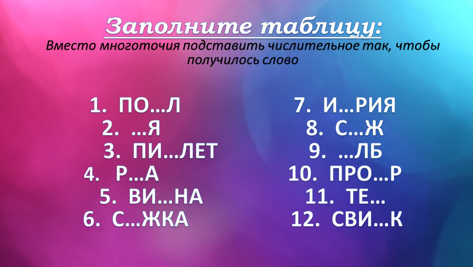 Заполните таблицу:Вместо многоточия подставить числительное так, чтобы получилось слово