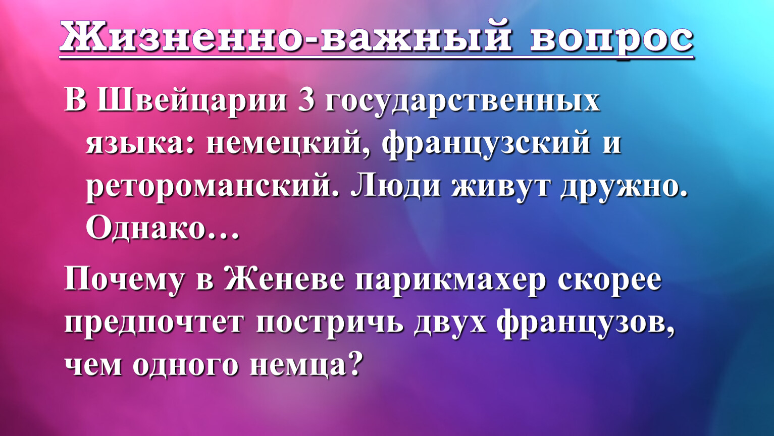 В Швейцарии 3 государственных языка: немецкий, французский и ретороманский. Люди живут дружно. Однако…