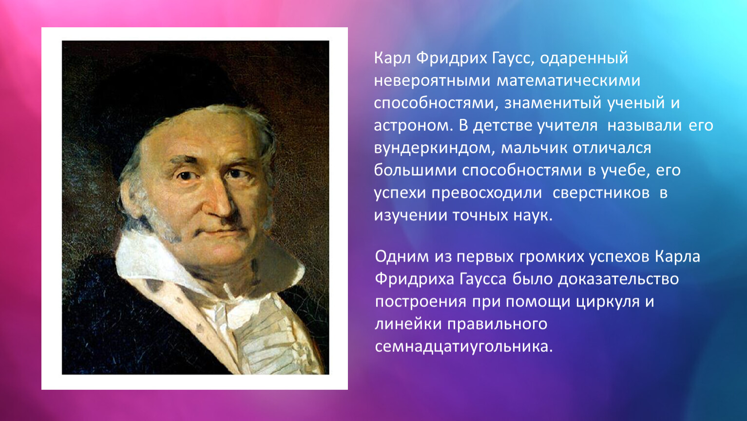 Карл Фридрих Гаусс, одаренный невероятными математическими способностями, знаменитый ученый и астроном. В детстве учителя называли его вундеркиндом, мальчик отличался большими способностями в учебе, его успехи превосходили сверстников в изучении точных наук.