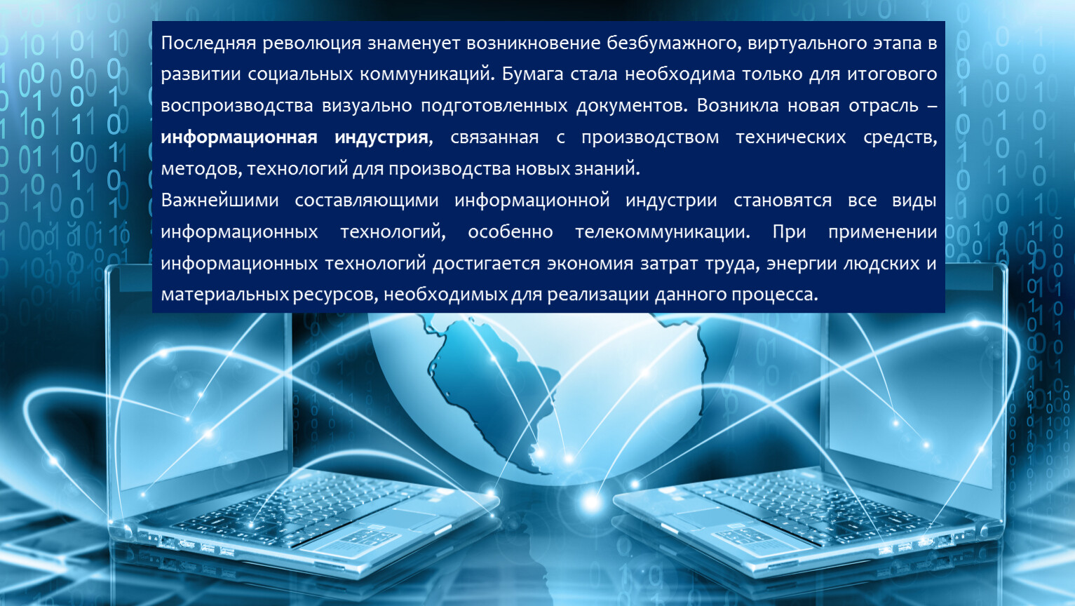 Важнейшими составляющими информационной индустрии становятся все виды информационных технологий, особенно телекоммуникации. При применении информационных технологий достигается экономия затрат труда, энергии людских и материальных ресурсов, необходимых для реализации данного процесса.