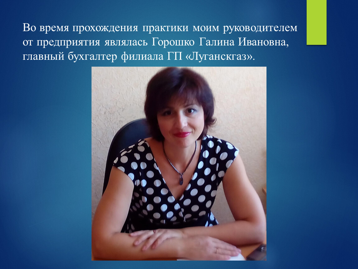 Во время прохождения практики моим руководителем от предприятия являлась Горошко Галина Ивановна, главный бухгалтер филиала ГП «Луганскгаз».