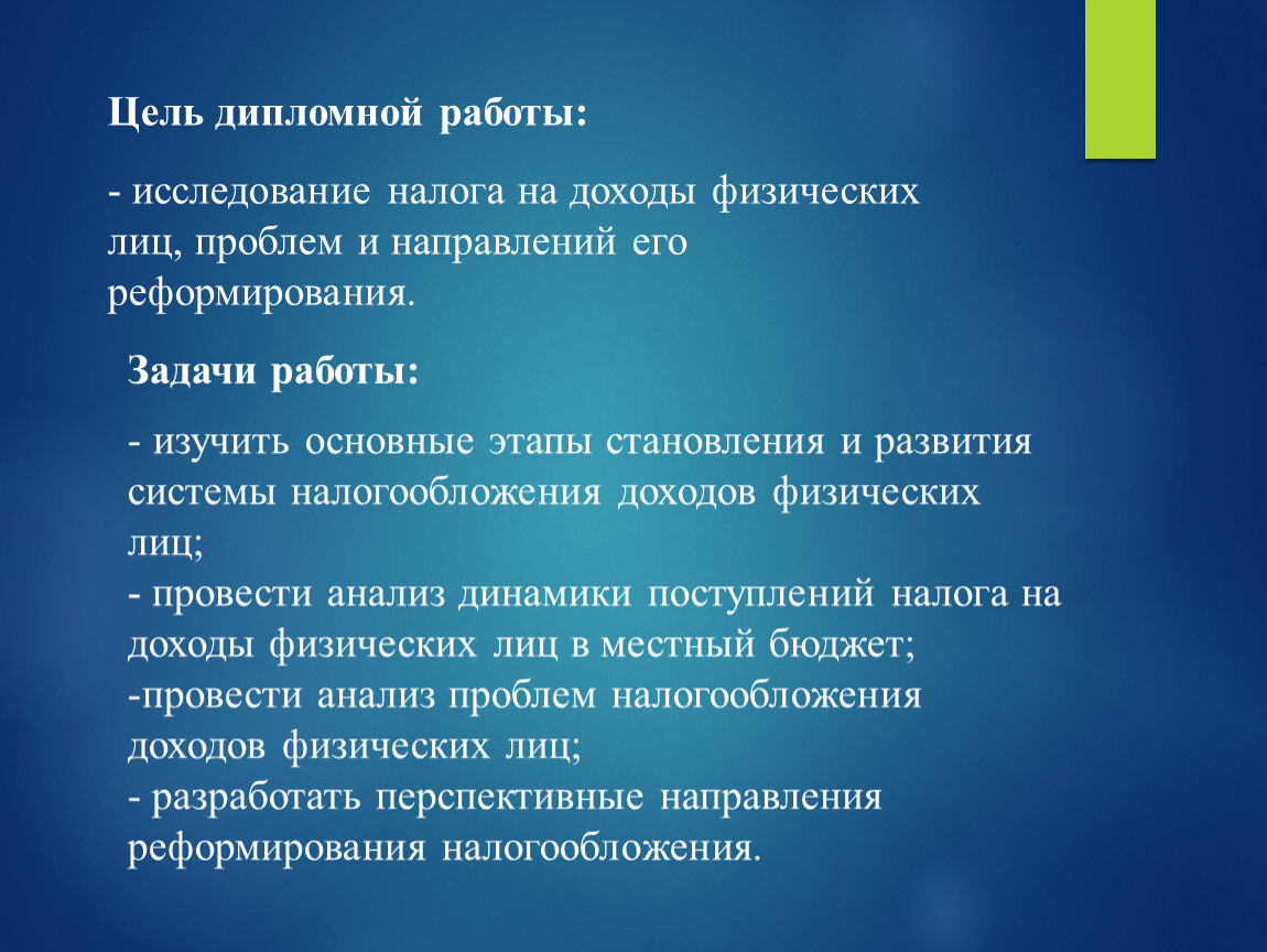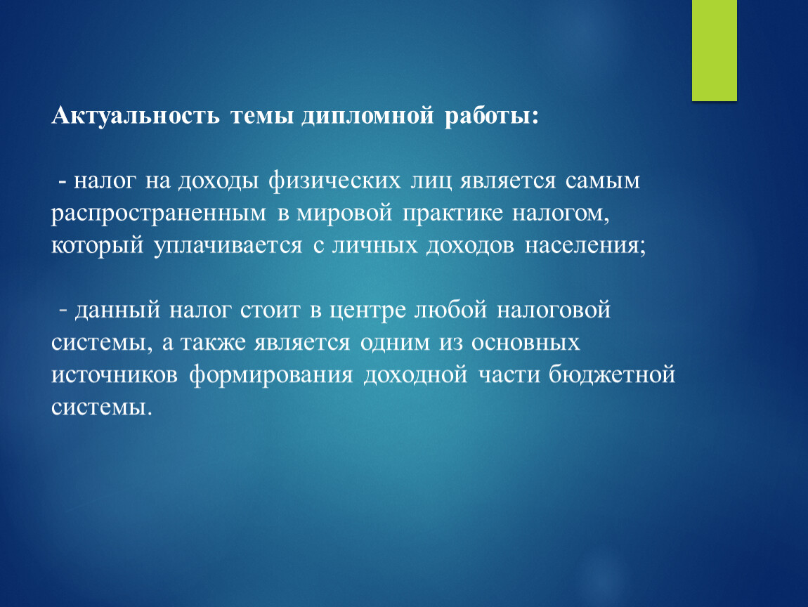 Актуальность темы дипломной работы: - налог на доходы физических лиц является самым распространенным в мировой практике налогом, который уплачивается с личных доходов населения; - данный налог стоит в центре любой налоговой системы, а также является одним из основных источников формирования доходной части бюджетной системы.