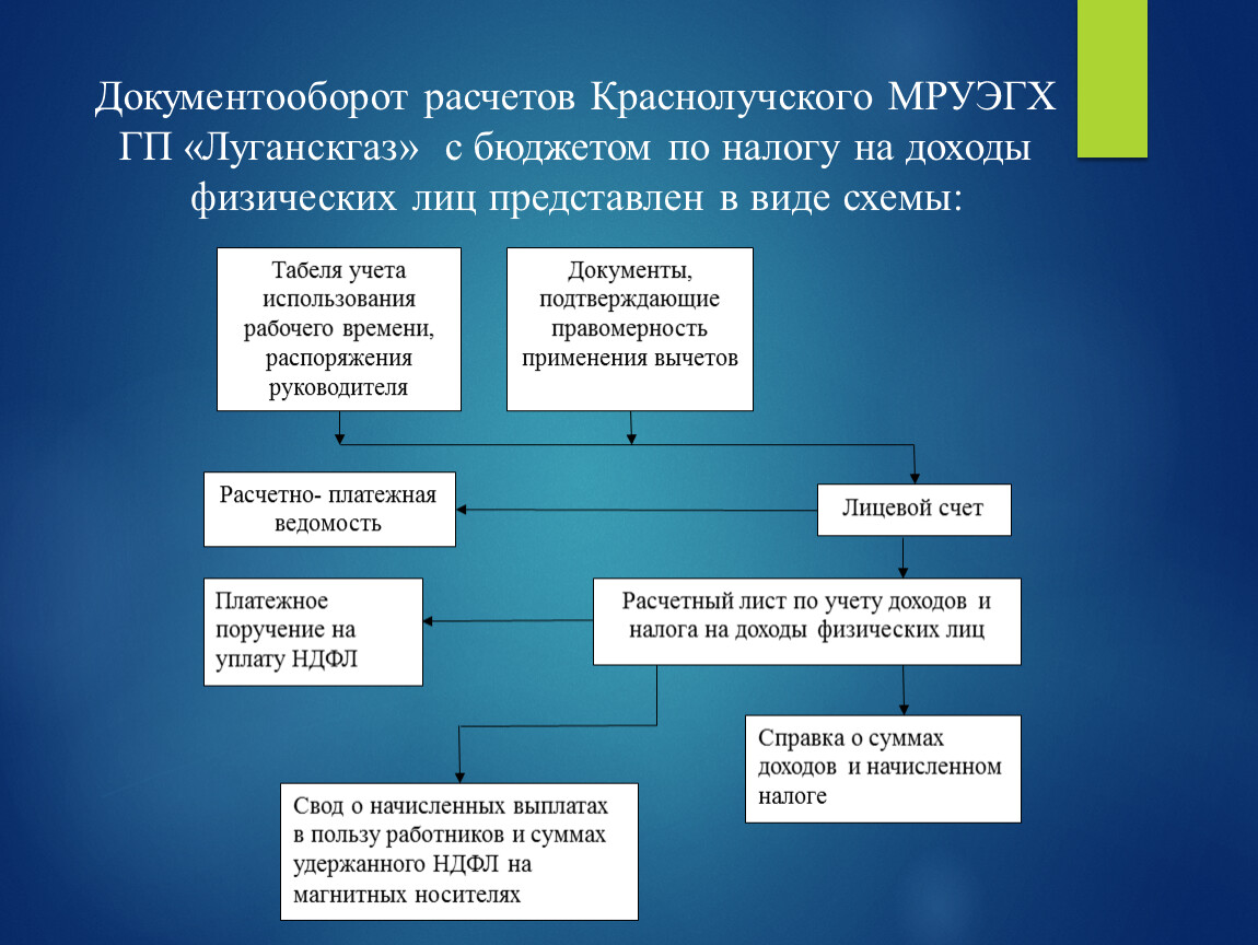 Документооборот расчетов Краснолучского МРУЭГХ ГП «Луганскгаз» с бюджетом по налогу на доходы физических лиц представлен в виде схемы: