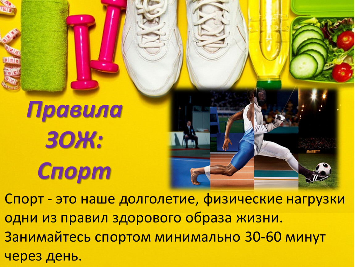 Спорт - это наше долголетие, физические нагрузки одни из правил здорового образа жизни. Занимайтесь спортом минимально 30-60 минут через день.