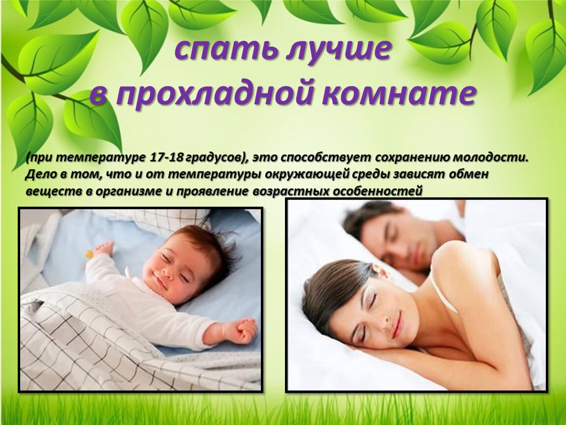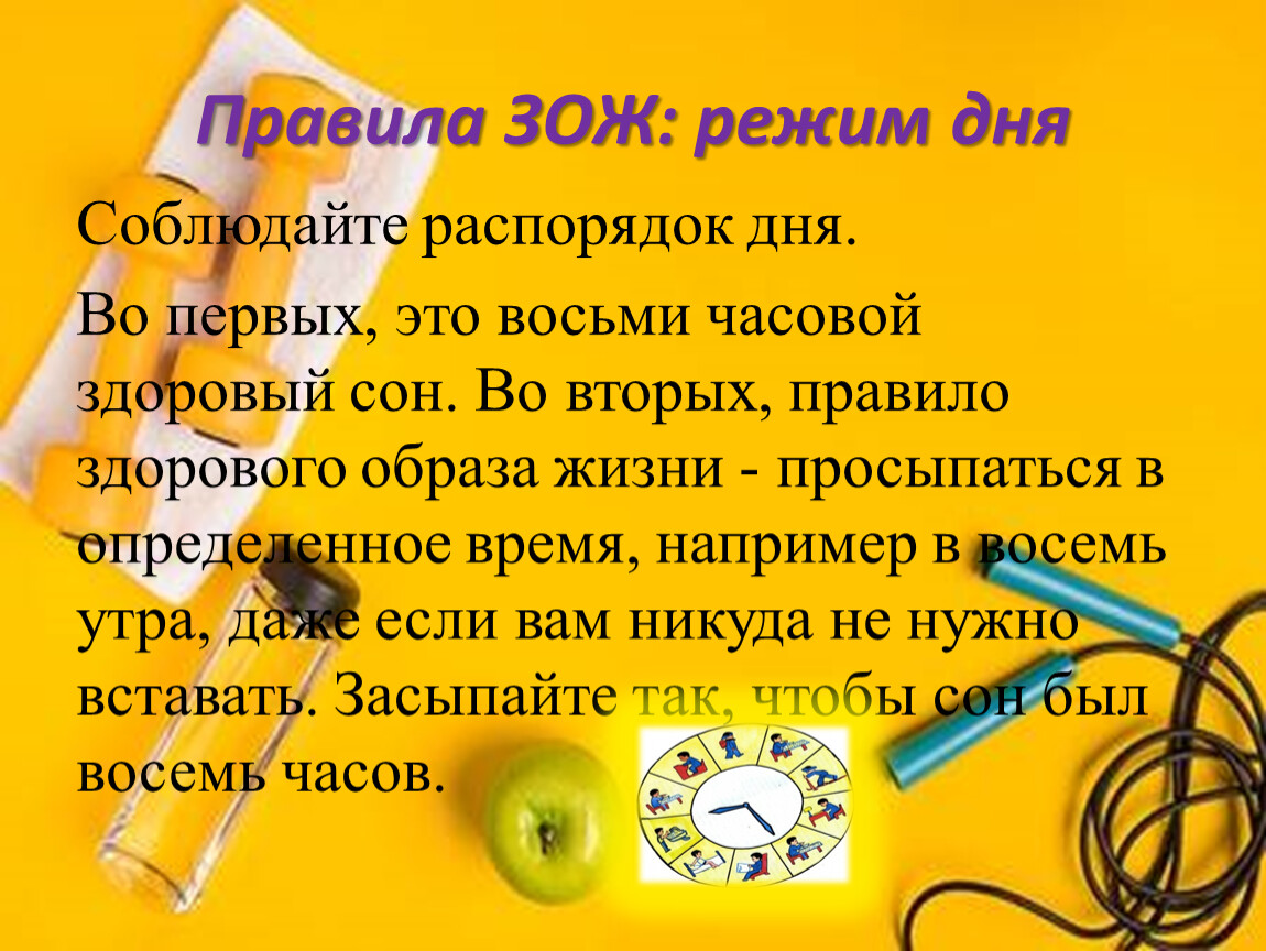 Во первых, это восьми часовой здоровый сон. Во вторых, правило здорового образа жизни - просыпаться в определенное время, например в восемь утра, даже если вам никуда не нужно вставать. Засыпайте так, чтобы сон был восемь часов.