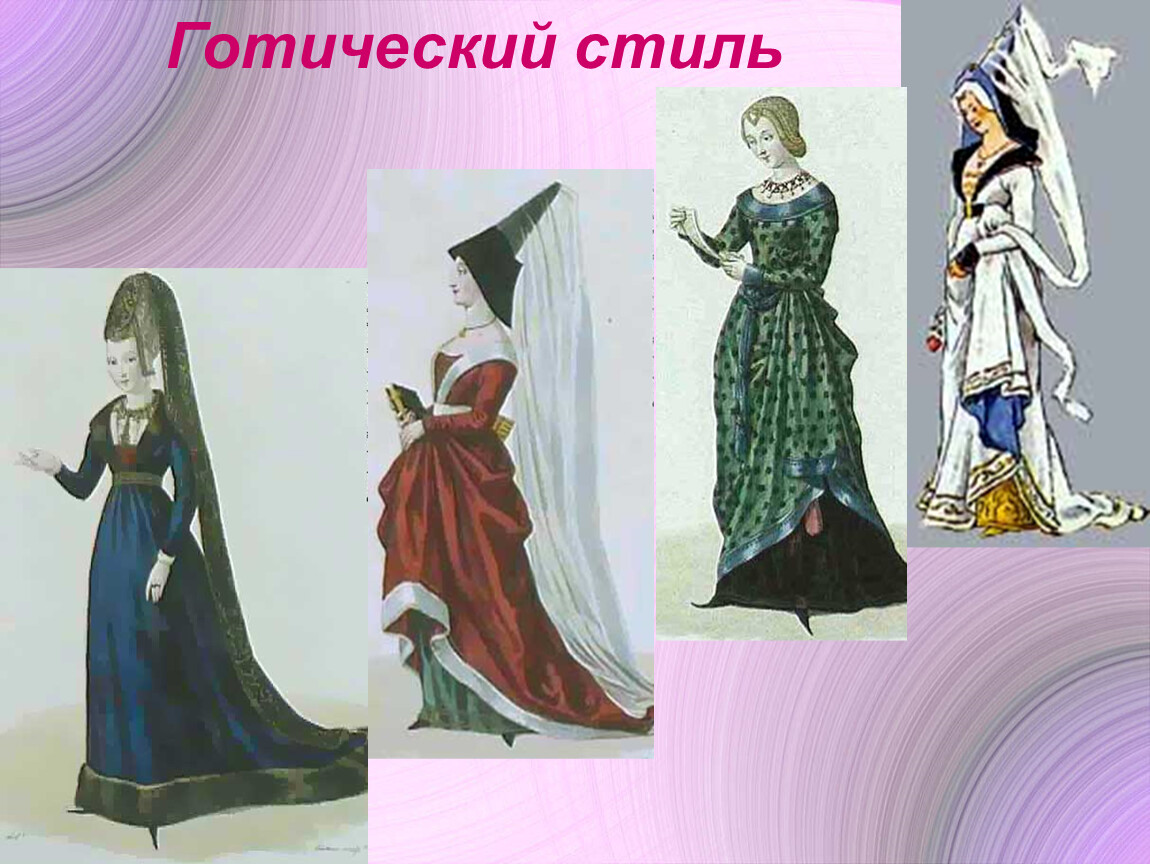 Стиль средневековой Европы XII-XIII вв.- заключается в подчеркивании вертикальных линий в одежде. Платье средневековых женщин имело очень высокую линию талии, декольте удлиненной формы, узкие длинные рукава, юбку, собранную в складки обычно только с одной стороны. Причем юбка расширялась книзу и переходила в длинный шлейф. Дополняли этот наряд конусообразный головной убор(высотой 70 см), который напоминал башни готического собора, и остроносая обувь.