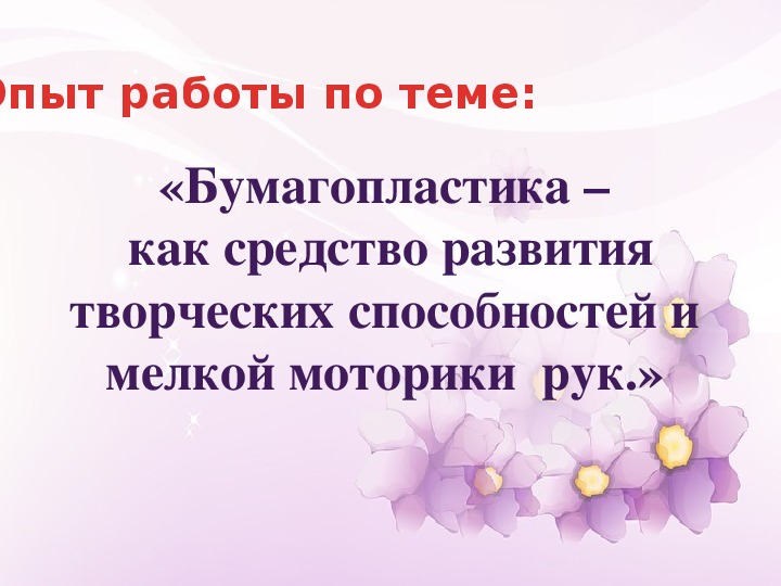 Данный материал представляет опыт работы по темесамообразования «Бумагопластика –как средство развития творческих способностей и