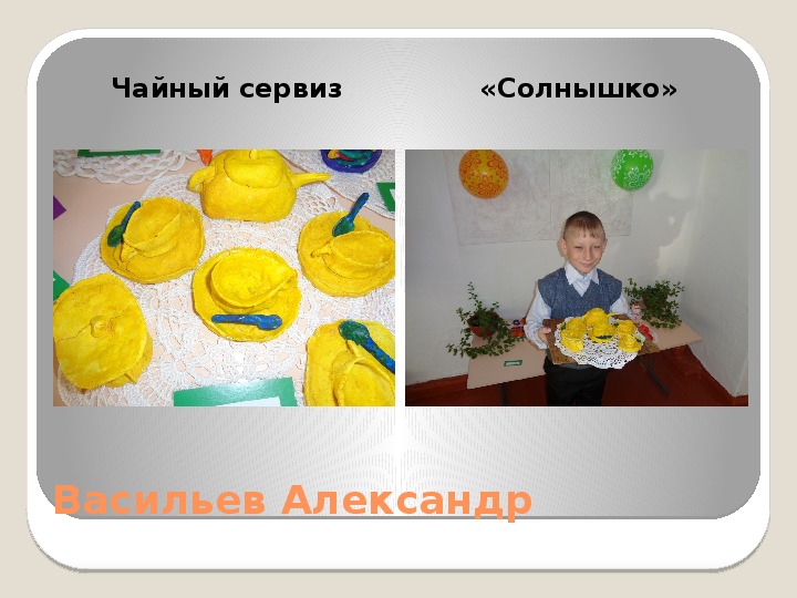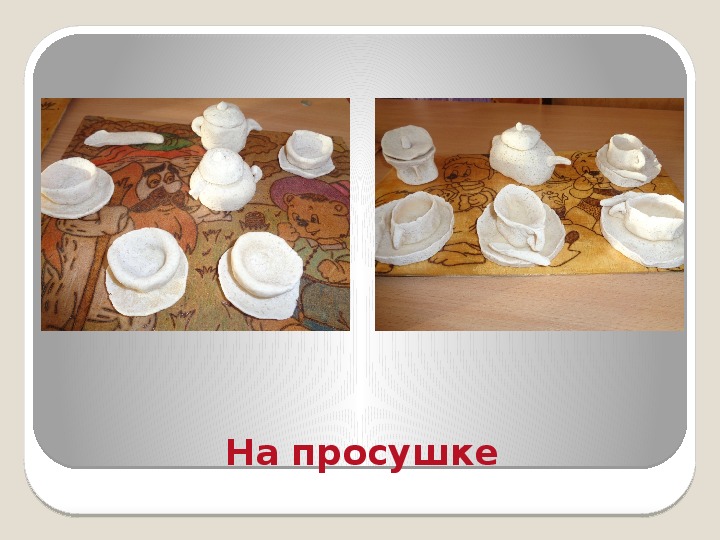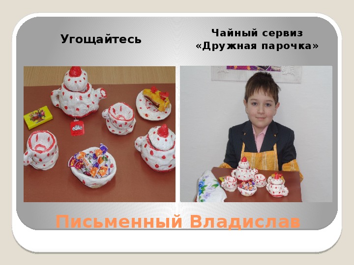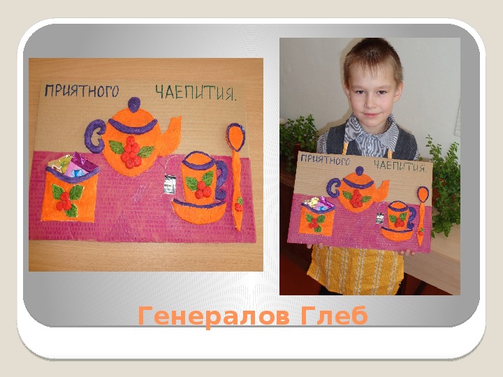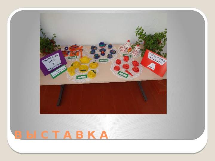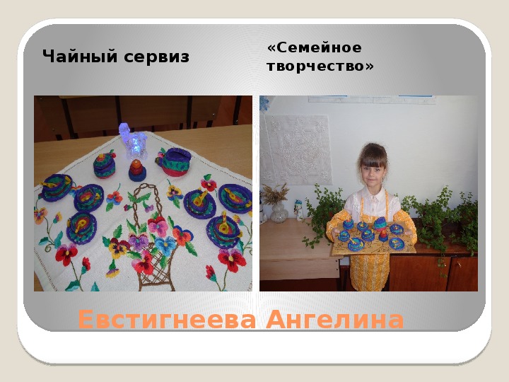 В нашей презентации показаны работы обучающихся и их родителей. В изготовлении работ принимали участие и наши папы. Они у нас очень активные. В презентации показаны работы, которые совместно можно выполнять как в школе. так и дома. Они красивые и прочные. Выполнены из солёного теста.Презентация "Чайный сервиз"