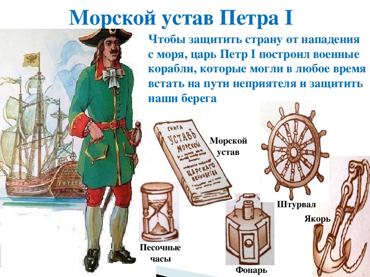 Морской устав Петра I Чтобы защитить страну от нападения с моря, царь Петр I построил военные корабли, которые могли в любое время встать на пути неприятеля и защитить наши берегаПризентация для детей старшего дошкольного возраста 23 февраля День защитника отечества