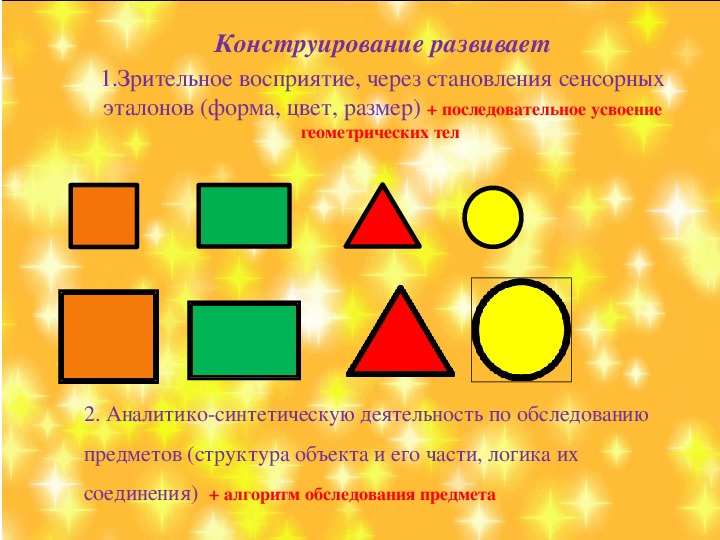 эталонов (форма, цвет, размер) + последовательное усвоение