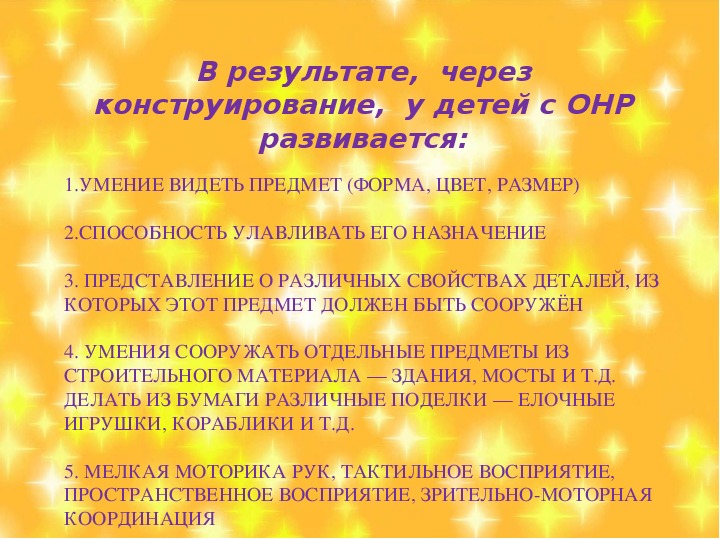 Презентация помогает ответить на вопросы: Для чего нужен конструктор?, Кому могут быть полезны игры с конструктором? Какой конструктор лучше? Презентация помогает понять родителям детей с ОНР, как важно для детей развитие мелкой моторики. Материал предназначен для родителей, с целью повышения их педагогической грамотности.