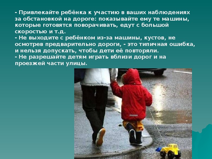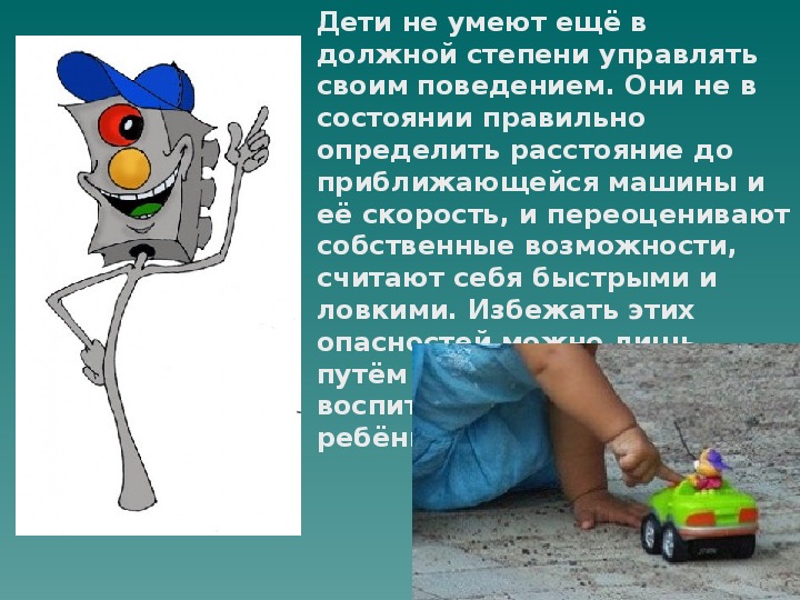 Данная работа была создана для просмотра родителям с целью профилактики детского травматизма на дороге.Взрослые не всегда знают как правильно научить ребенка соблюдать правила дорожного движения.Для лучшего восприятия ребенком информации о ПДД, родителям самим необходимо знать причинно-следственные связи неосторожного поведения ребенка на дороге.Данная презентация как раз и объясняет причины.