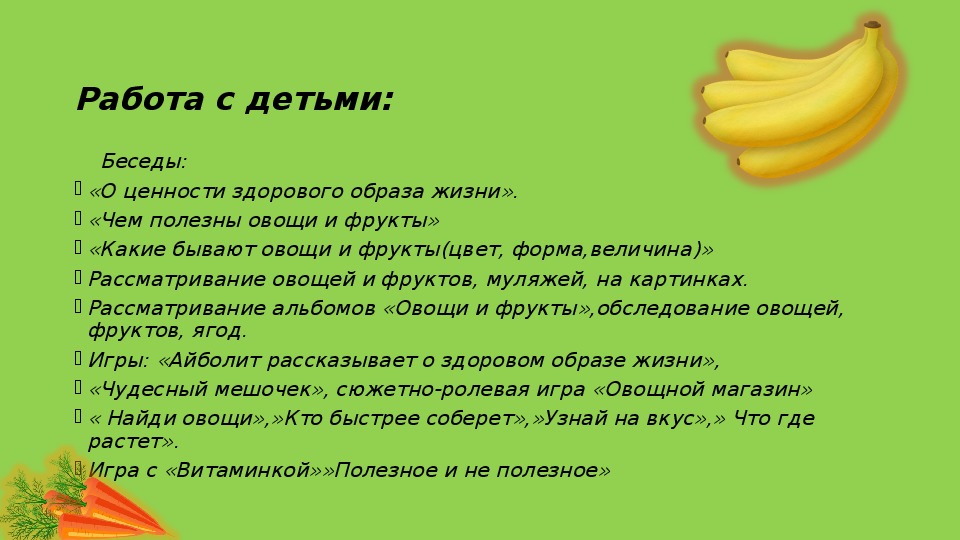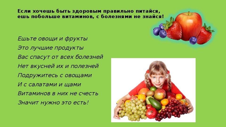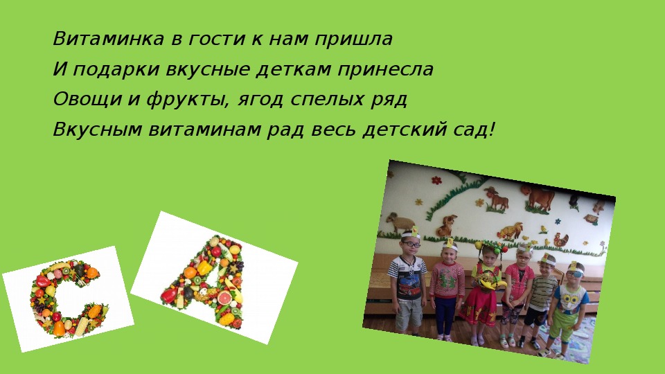«Забота о здоровье ребенка –это важнейший труд воспитателя» В.А.Сухомлинский. Презентация о витаминах. Цель :углублять и систематизировать представления детей о факторах ,влияющих на здоровье, обогащать знания детей о наличии витаминов в фруктах и овощах, их полезных свойствах, активизировать работу с семьей по проблеме формирования привычки к здоровому образу жизни.