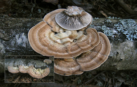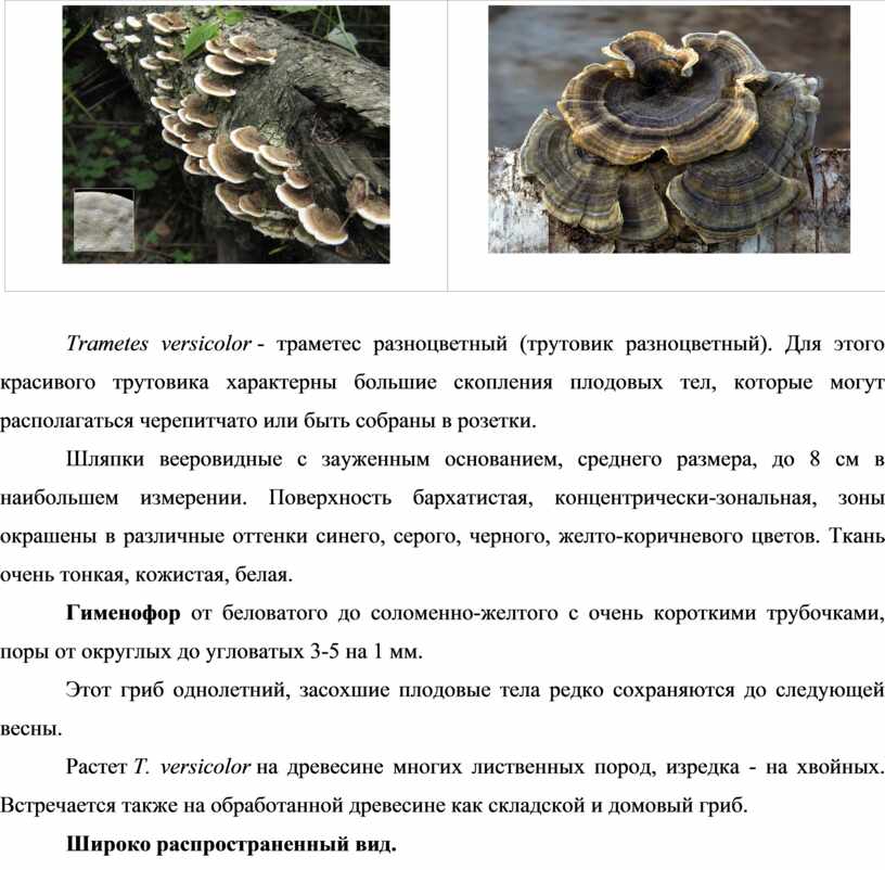 Trametes versicolor - траметес разноцветный (трутовик разноцветный). Для этого красивого трутовика характерны большие скопления плодовых тел, которые могут располагаться черепитчато или быть собраны в розетки.