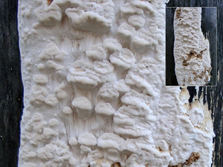 На деревянных перекрытиях в плохо проветриваемых влажных помещениях встречается особая форма с желвакообразными плодовыми телами и губчатой поверхностью.