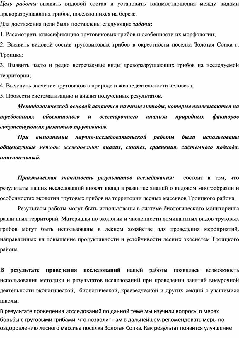 Практическая значимость результатов исследования: состоит в том, что результаты наших исследований вносят вклад в развитие знаний о видовом многообразии и особенностях экологии трутовых грибов на территории лесных массивов Троицкого района.