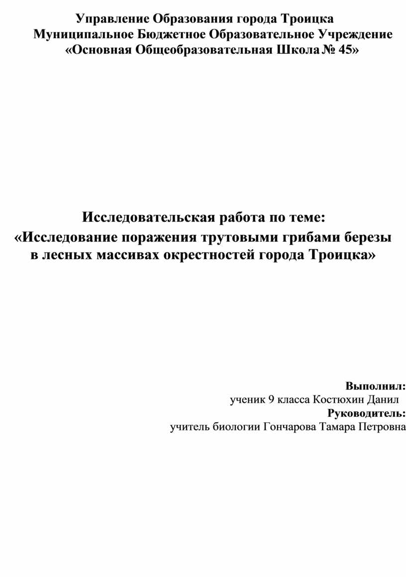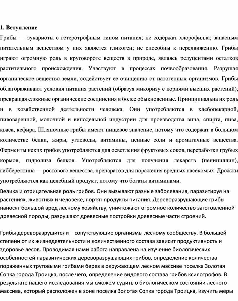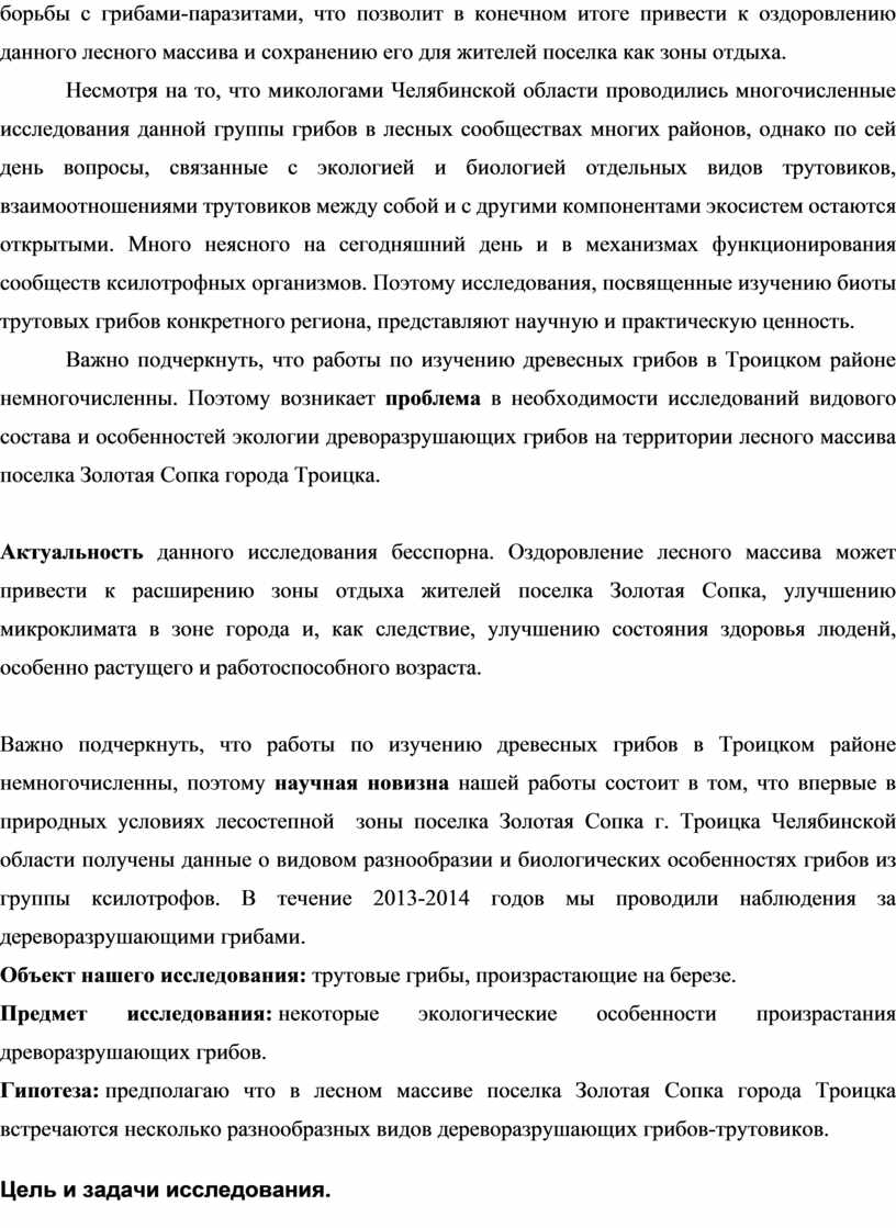 Важно подчеркнуть, что работы по изучению древесных грибов в Троицком районе немногочисленны. Поэтому возникает проблема в необходимости исследований видового состава и особенностей экологии древоразрушающих грибов на территории лесного массива поселка Золотая Сопка города Троицка.