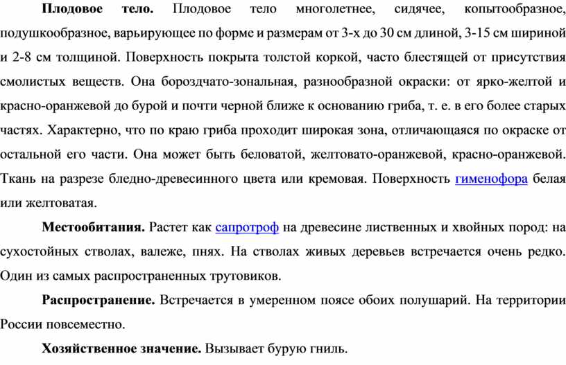 Плодовое тело. Плодовое тело многолетнее, сидячее, копытообразное, подушкообразное, варьирующее по форме и размерам от 3-х до 30 см длиной, 3-15 см шириной и 2-8 см толщиной. Поверхность покрыта толстой коркой, часто блестящей от присутствия смолистых веществ. Она бороздчато-зональная, разнообразной окраски: от ярко-желтой и красно-оранжевой до бурой и почти черной ближе к основанию гриба, т. е. в его более старых частях. Характерно, что по краю гриба проходит широкая зона, отличающаяся по окраске от остальной его части. Она может быть беловатой, желтовато-оранжевой, красно-оранжевой. Ткань на разрезе бледно-древесинного цвета или кремовая. Поверхность гименофора белая или желтоватая.