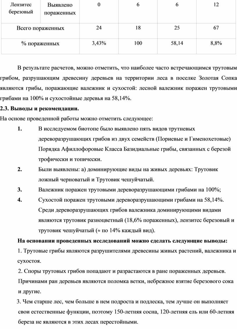 В результате расчетов, можно отметить, что наиболее часто встречающимся трутовым грибом, разрушающим древесину деревьев на территории леса в поселке Золотая Сопка являются грибы, поражающие валежник и сухостой: лесной валежник поражен трутовыми грибами на 100% и сухостойные деревья на 58,14%.