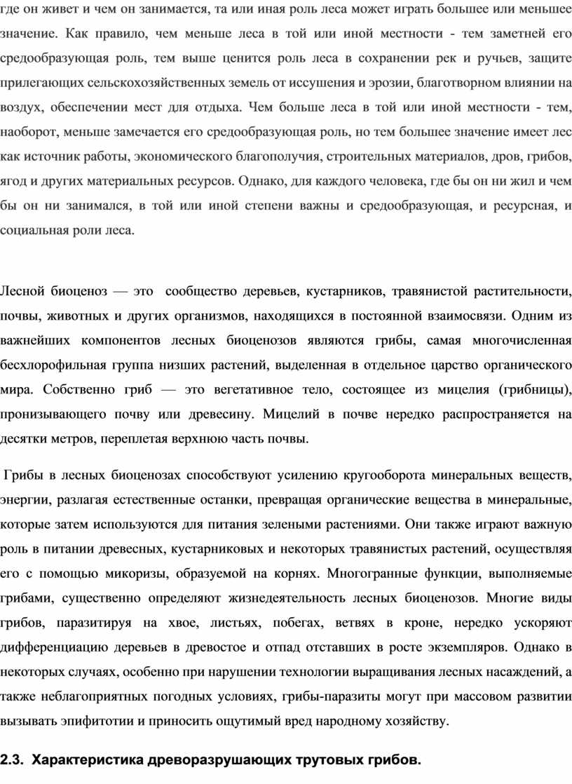 Лесной биоценоз — это сообщество деревьев, кустарников, травянистой растительности, почвы, животных и других организмов, находящихся в постоянной взаимосвязи. Одним из важнейших компонентов лесных биоценозов являются грибы, самая многочисленная бесхлорофильная группа низших растений, выделенная в отдельное царство органического мира. Собственно гриб — это вегетативное тело, состоящее из мицелия (грибницы), пронизывающего почву или древесину. Мицелий в почве нередко распространяется на десятки метров, переплетая верхнюю часть почвы.