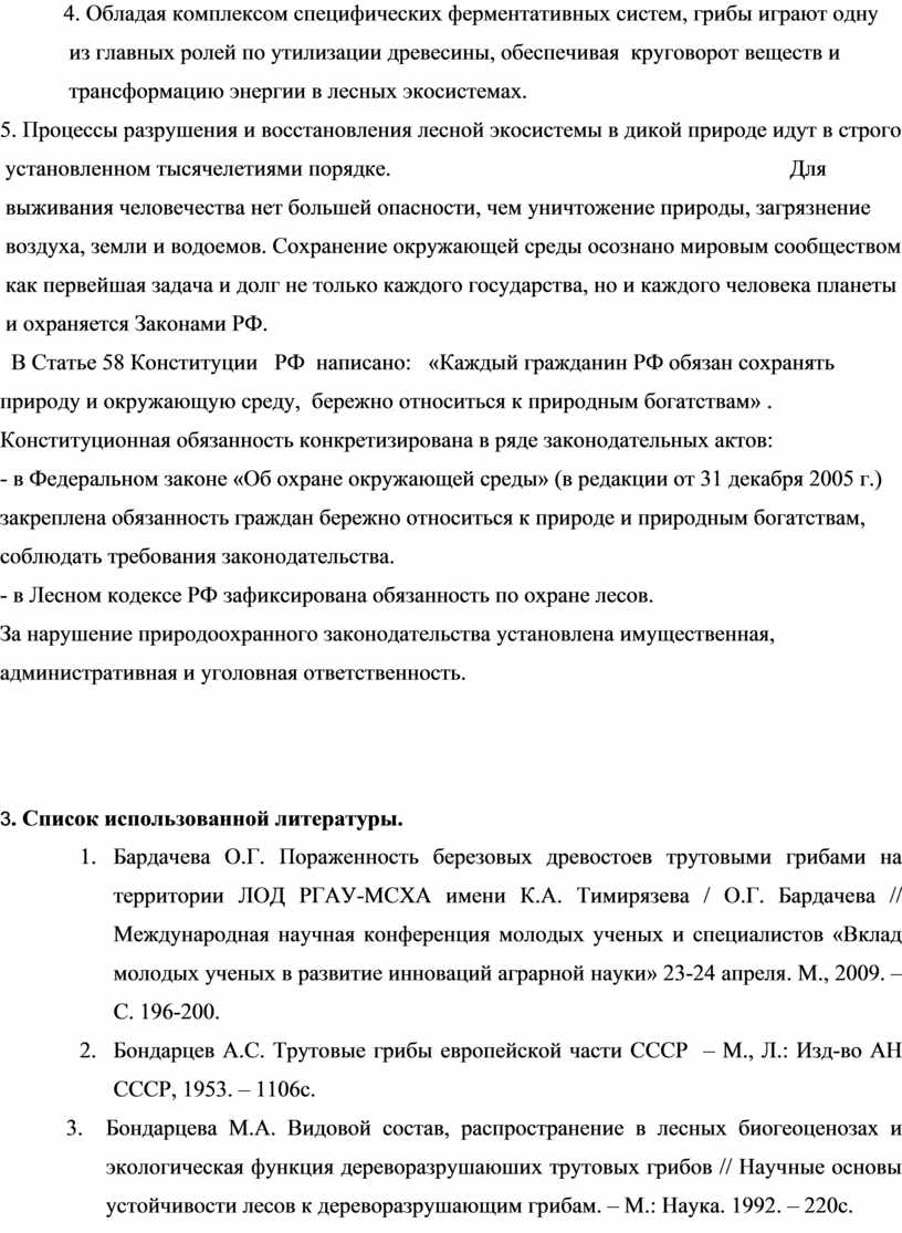 3. Бондарцева М.А. Видовой состав, распространение в лесных биогеоценозах и экологическая функция дереворазрушаюших трутовых грибов // Научные основы устойчивости лесов к дереворазрушающим грибам. – М.: Наука. 1992. – 220с.