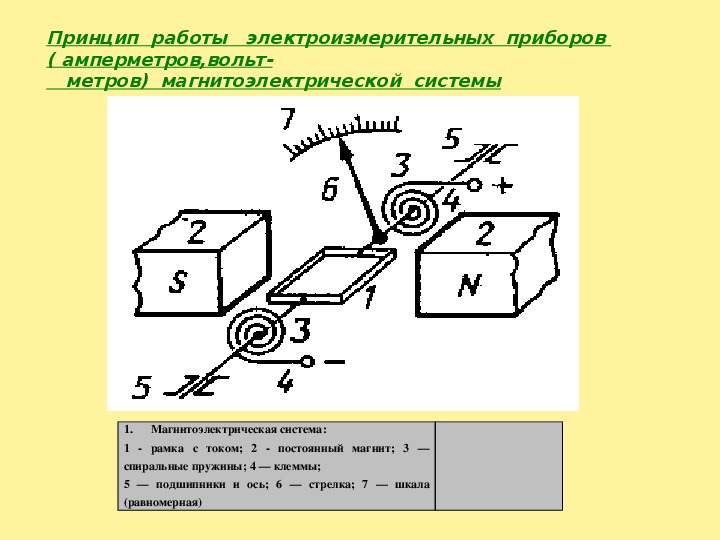 5 — подшипники и ось; 6 — стрелка; 7 — шкала