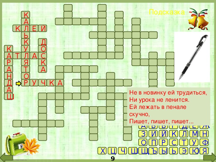 Перед началом работы на втором слайде дана инструкция по выполнению.Ответ вписывается при помощи алфавита расположенного на слайде. Если возникли трудности при ответе на вопрос, можно воспользоваться подсказкой, для этого необходимо нажать на слово «Подсказка». Переход к следующему заданию осуществляется при помощи стрелки "влево", а если возникла необходимость вернуться назад, то можно воспользоваться кнопкой "вправо".