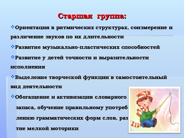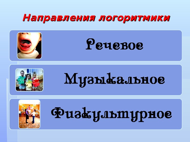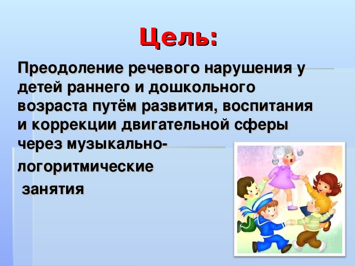 Данная презентация предназначена для педагогов и музыкальных руководителей дошкольных образовательных учреждений. В ней обозначены цели, задачи и направления работы по логоритмике с детьми дошкольного возраста, включая физкультурно оздоровительную работу в ДОУ. А также подробно описаны особенности логоритмической работы по возрастам.