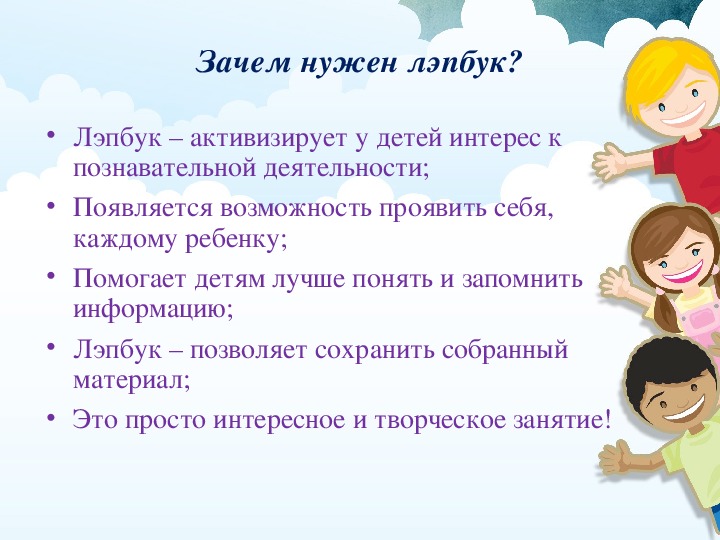 Лэпбук - это современное доступное средство обучения, способствующее взаимодействию всех участников образовательного процесса. В отличие от ИКТ, которые активно внедряются в педагогический процесс дошкольных образовательных учреждений, явный минус использования ИКТ, то что они замещают живое эмоциональное общение детей со взрослыми, с родителями, детей друг с другом.