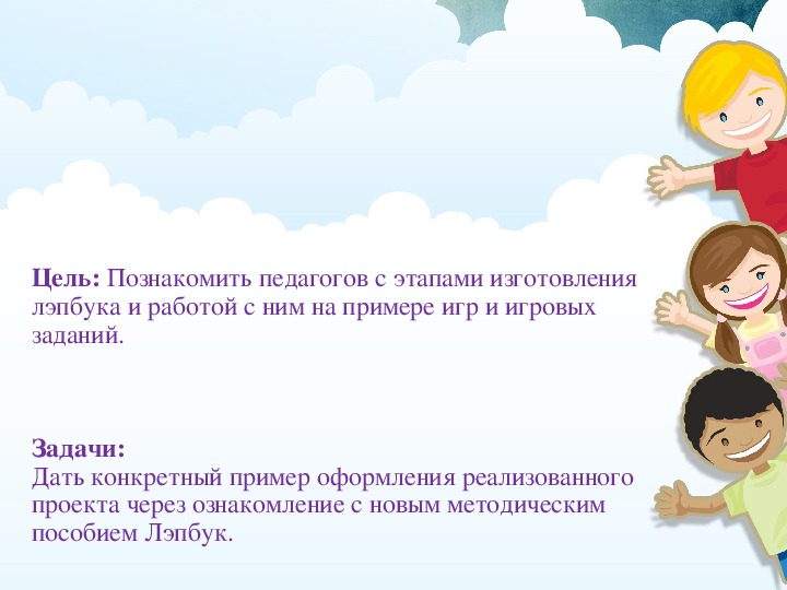 Цель: Познакомить педагогов с этапами изготовления лэпбука и работой с ним на примере игр и игровых заданий.