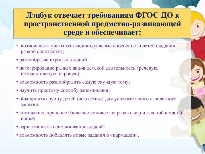 Лэпбук отвечает требованиям ФГОС ДО к пространственной предметноразвивающей среде и обеспечивает: