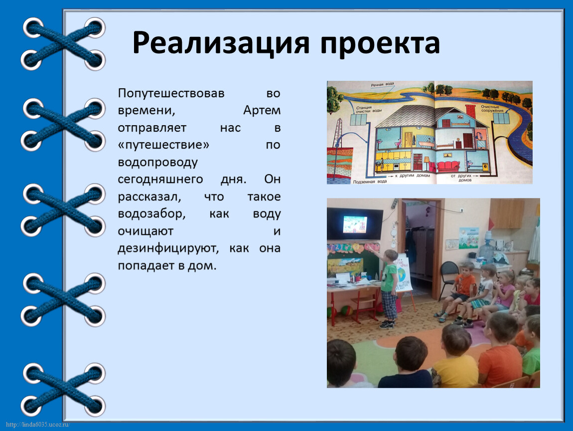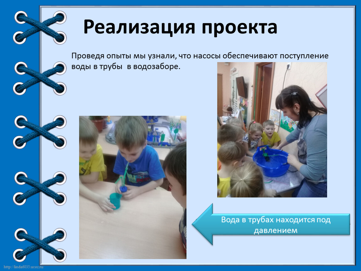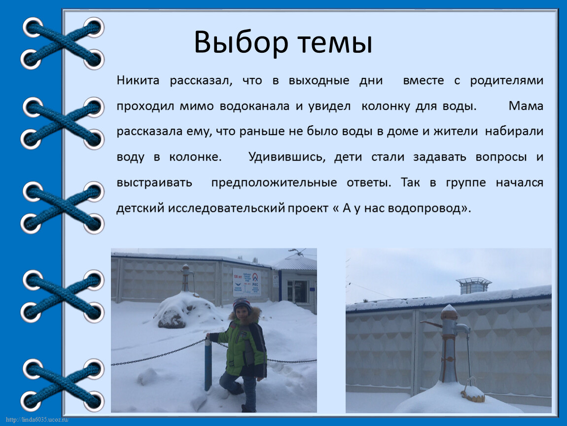 Никита рассказал, что в выходные дни вместе с родителями проходил мимо водоканала и увидел колонку для воды. Мама рассказала ему, что раньше не было воды в доме и жители набирали воду в колонке. Удивившись, дети стали задавать вопросы и выстраивать предположительные ответы. Так в группе начался детский исследовательский проект « А у нас водопровод».