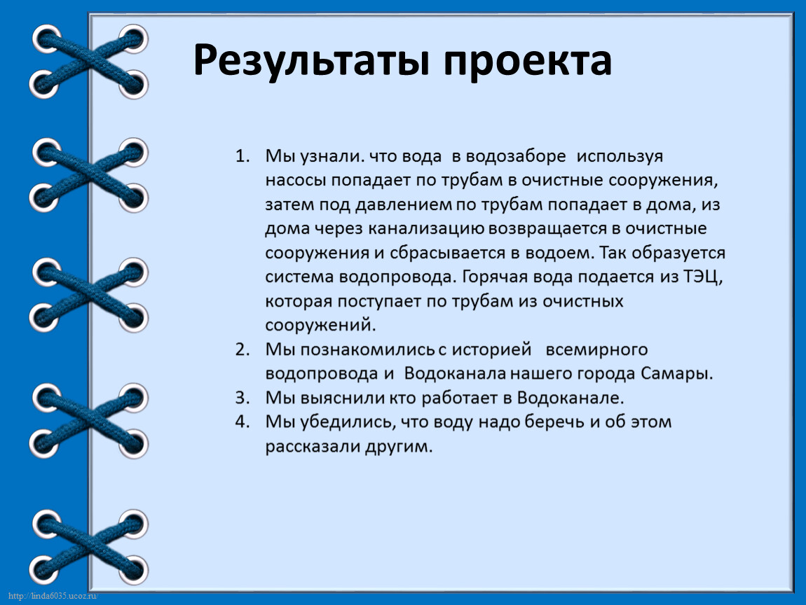 Мы узнали. что вода в водозаборе используя насосы попадает по трубам в очистные сооружения, затем под давлением по трубам попадает в дома, из дома через канализацию возвращается в очистные сооружения и сбрасывается в водоем. Так образуется система водопровода. Горячая вода подается из ТЭЦ, которая поступает по трубам из очистных сооружений.