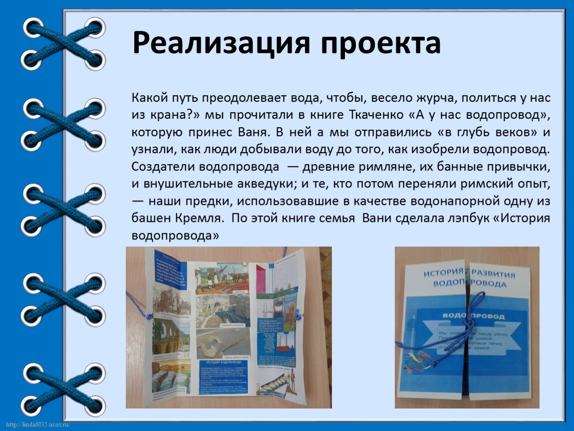Какой путь преодолевает вода, чтобы, весело журча, политься у нас из крана?» мы прочитали в книге Ткаченко «А у нас водопровод», которую принес Ваня. В ней а мы отправились «в глубь веков» и узнали, как люди добывали воду до того, как изобрели водопровод. Создатели водопровода — древние римляне, их банные привычки, и внушительные акведуки; и те, кто потом переняли римский опыт, — наши предки, использовавшие в качестве водонапорной одну из башен Кремля. По этой книге семья Вани сделала лэпбук «История водопровода»