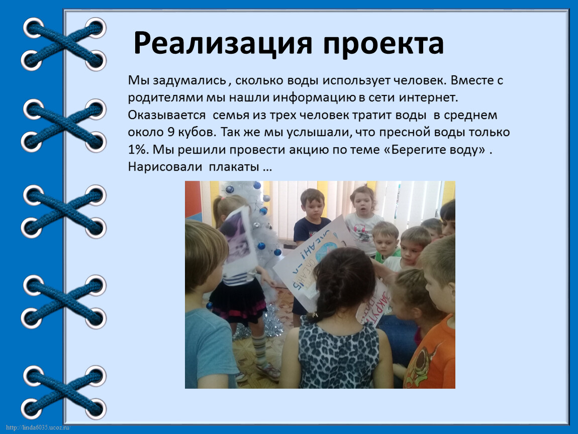 Мы задумались , сколько воды использует человек. Вместе с родителями мы нашли информацию в сети интернет. Оказывается семья из трех человек тратит воды в среднем около 9 кубов. Так же мы услышали, что пресной воды только 1%. Мы решили провести акцию по теме «Берегите воду» . Нарисовали плакаты …