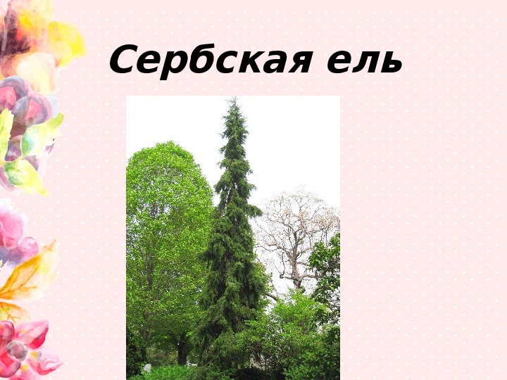 Презентация на тему "Виды елей". Познакомить детей с разнообразием елей. Показать им разные формы и цвета елей которые растут на разных уголках земного шара. о красоте их. Рассказать о целебных свойствах хвойных деревьев. О том, что они зимой и летом одного цвета.