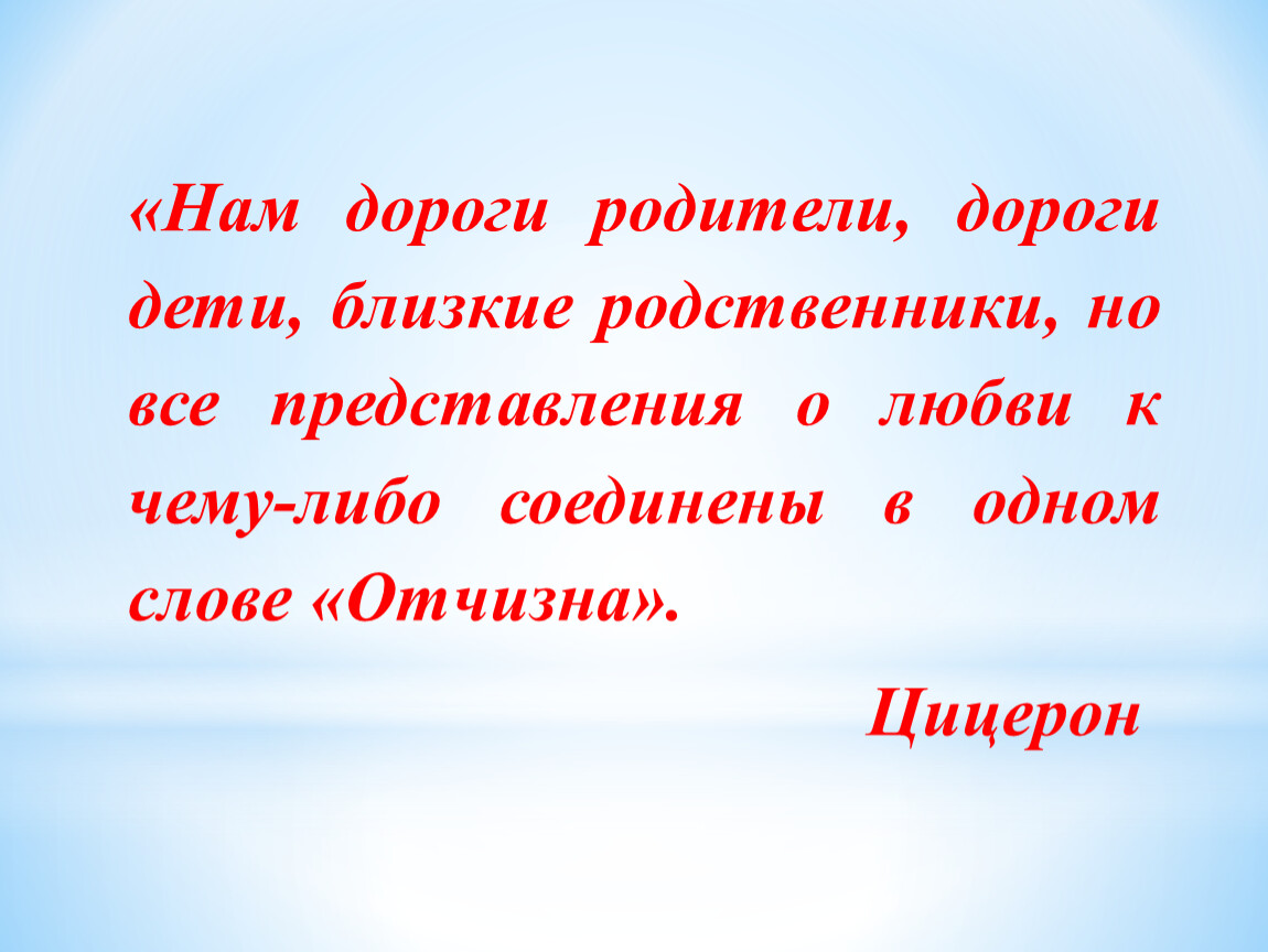 «Нам дороги родители, дороги дети, близкие родственники, но все представления о любви к чему-либо соединены в одном слове «Отчизна».