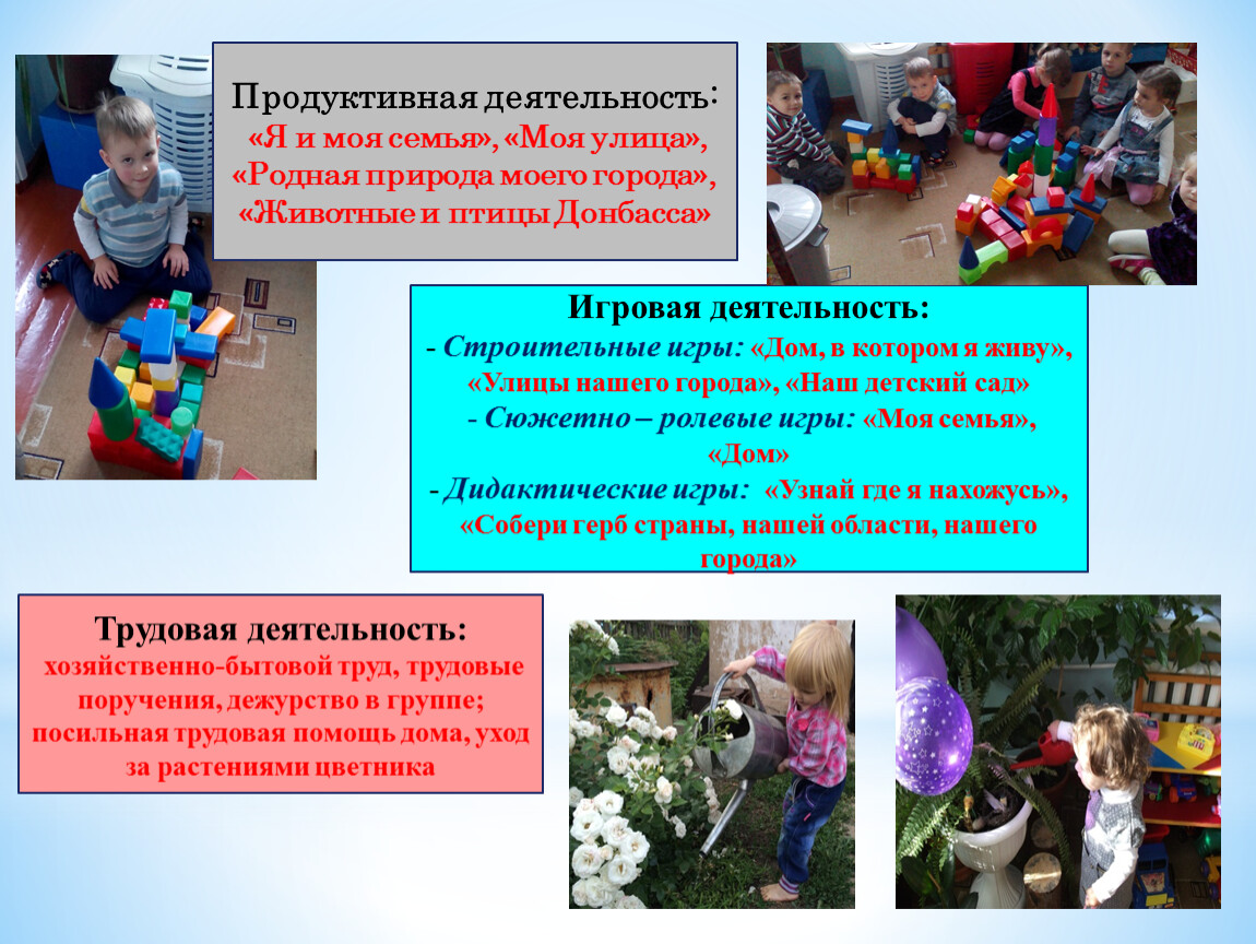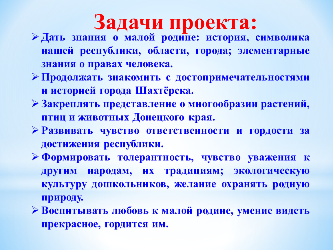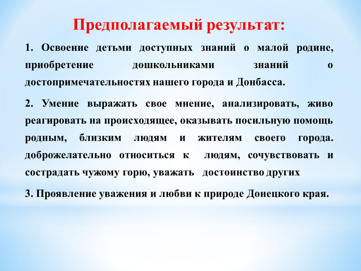1. Освоение детьми доступных знаний о малой родине, приобретение дошкольниками знаний о достопримечательностях нашего города и Донбасса.