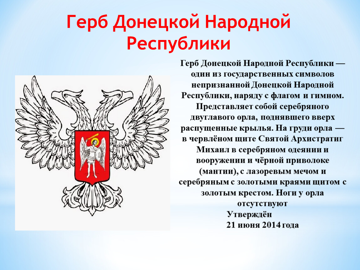 Герб Донецкой Народной Республики — один из государственных символов непризнанной Донецкой Народной Республики, наряду с флагом и гимном. Представляет собой серебряного двуглавого орла, поднявшего вверх распущенные крылья. На груди орла — в червлёном щите Святой Архистратиг Михаил в серебряном одеянии и вооружении и чёрной приволоке (мантии), с лазоревым мечом и серебряным с золотыми краями щитом с золотым крестом. Ноги у орла отсутствуют