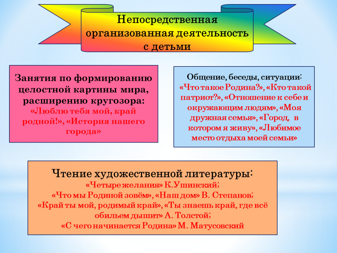 Общение, беседы, ситуации: «Что такое Родина?», «Кто такой патриот?», «Отношение к себе и окружающим людям», «Моя дружная семья», «Город, в котором я живу», «Любимое место отдыха моей семьи»