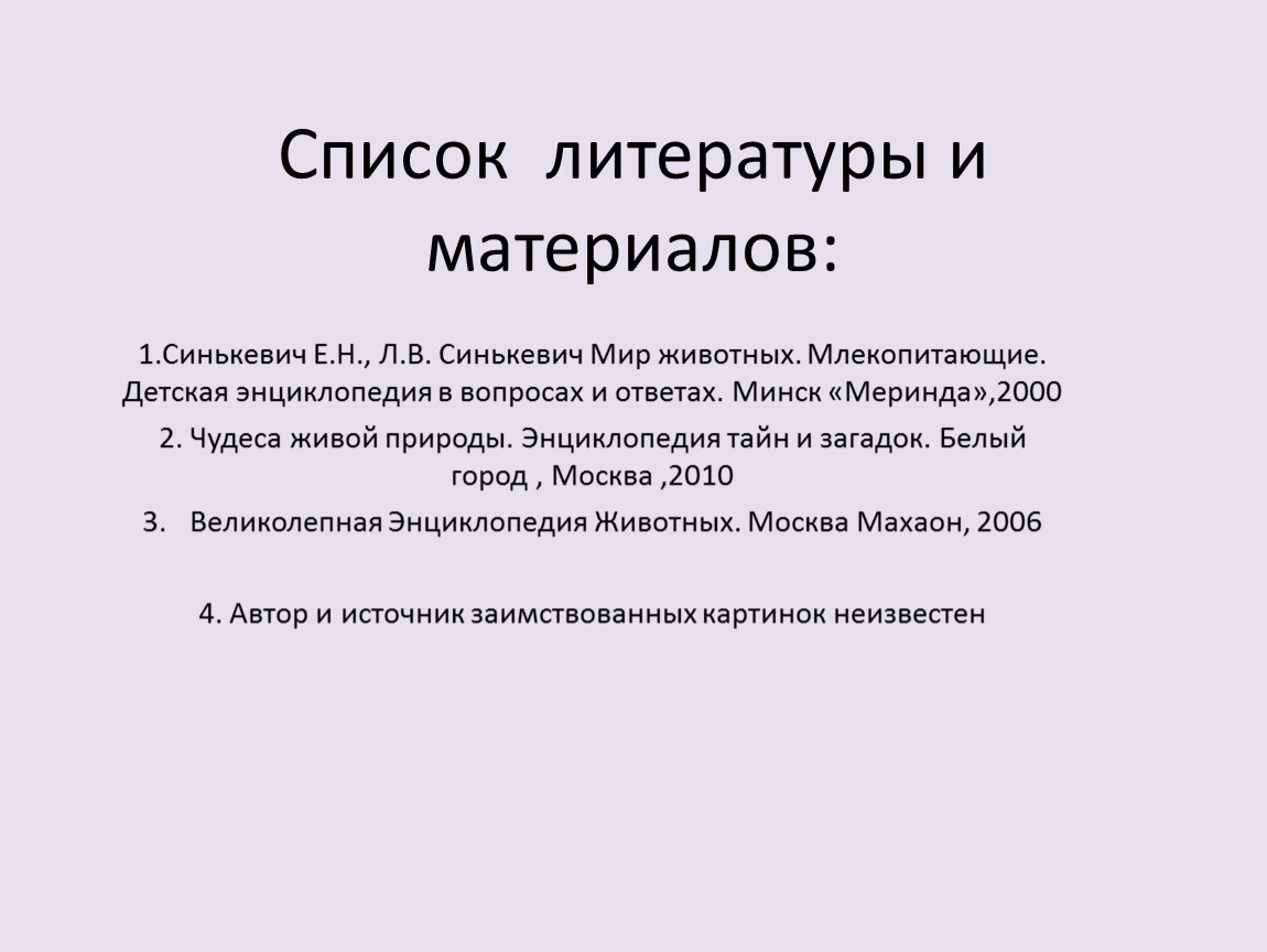 1.Синькевич Е.Н., Л.В. Синькевич Мир животных. Млекопитающие. Детская энциклопедия в вопросах и ответах. Минск «Меринда»,2000