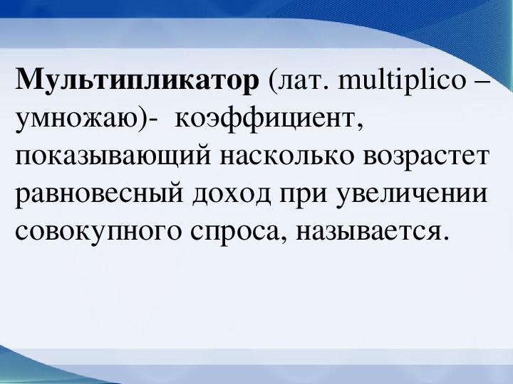 Презентация раскрывает такие понятия как совокупный спрос и предложения, а также знакомит обучающихся с законом Сэя, законом Самуэльсона – Ле Шателье и такими понятиями как парадокс макроанализа, экономический шок, мультипликатор. В презентации присутствует графическая информация. Материал предназначен для 10 класса.
