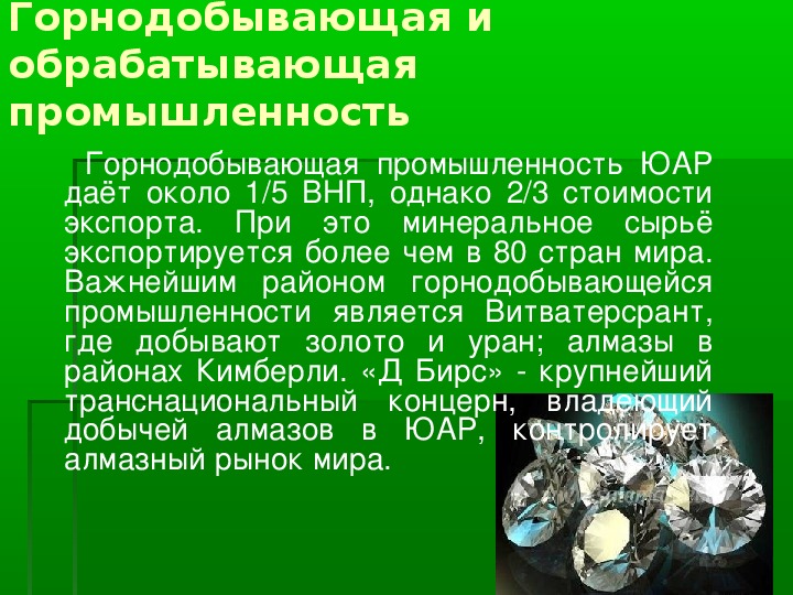 ЮАР-Загадочная страна.Расположенная на крайнем юге континента Южно-Африканская Республика до 1961г. называлась Южно-Африканским Союзом и входила в состав Британского содружества на правах доминиона. В стране со сложным расовым и этническим составом населения долгие годы продолжалась политика «раздельного развития» различных расовых групп – политика апартеида, которая фактически сводилась к угнетению белым меньшинством людей с тёмным цветом кожи. Положение изменилось после принятия конституции 1993 и 1996 гг. и первых всеобщих выборов, на которых победил долго боровшийся за права большинства Африканский национальный прогресс (АНК).презентация"ЮАР"