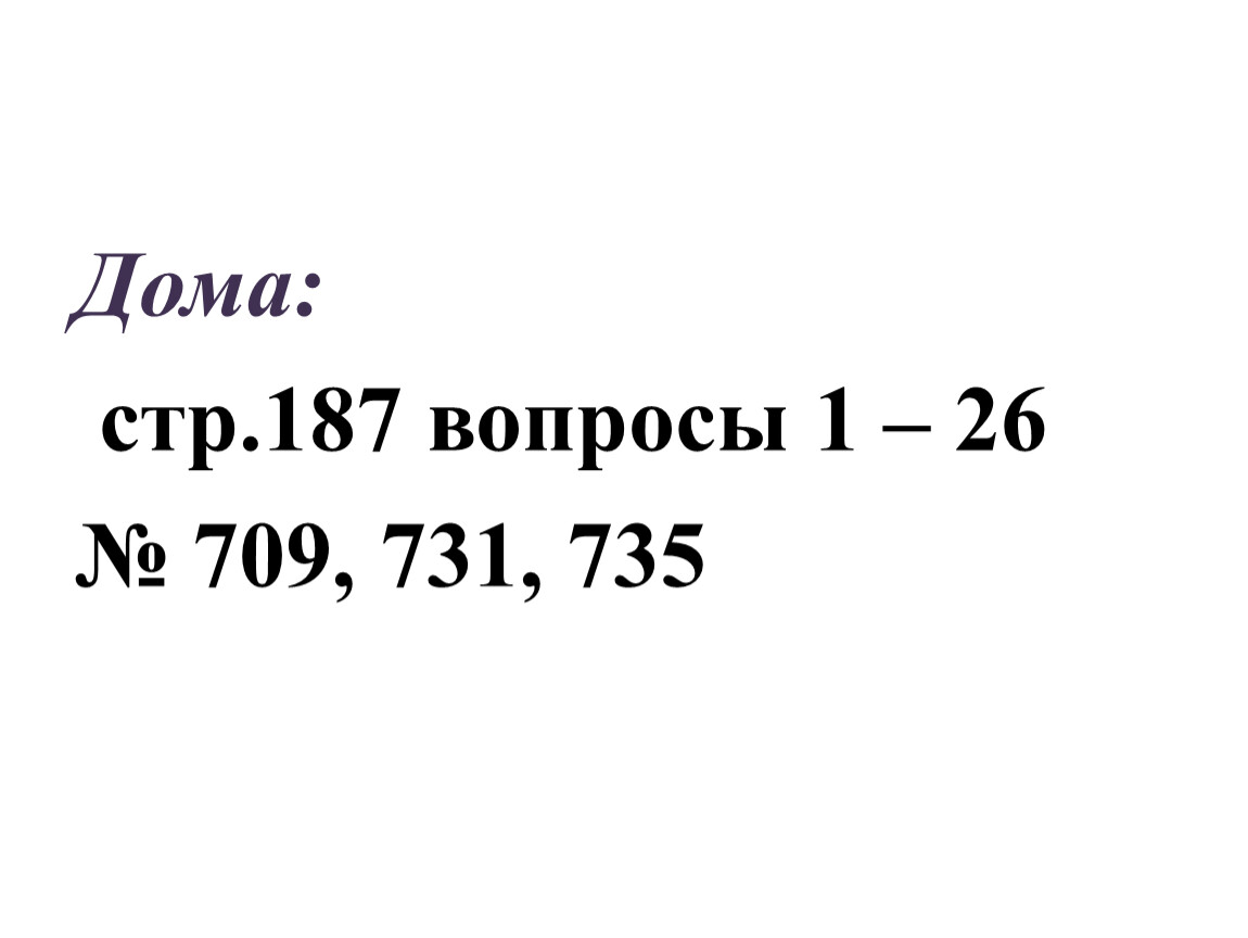 Дома: стр.187 вопросы 1 – 26 № 709, 731, 735