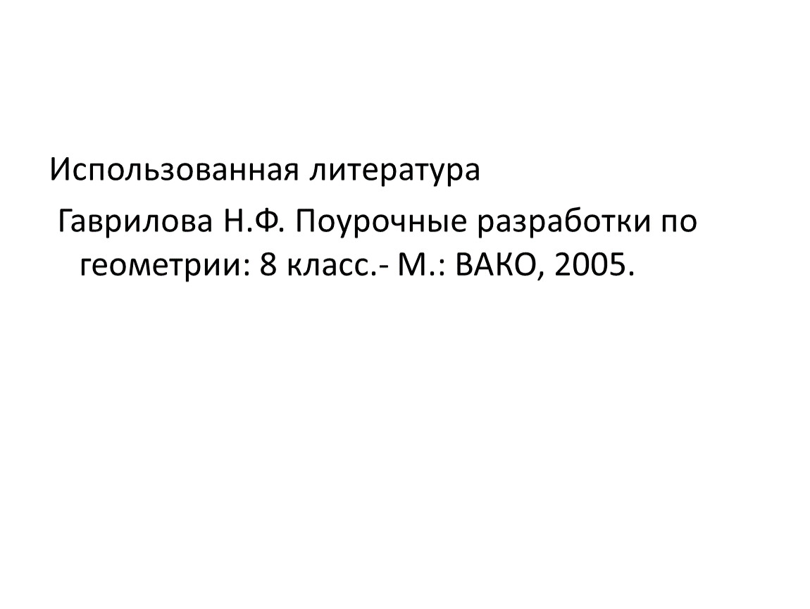 Использованная литература Гаврилова Н.Ф. Поурочные разработки по геометрии: 8 класс.- М.: ВАКО, 2005.