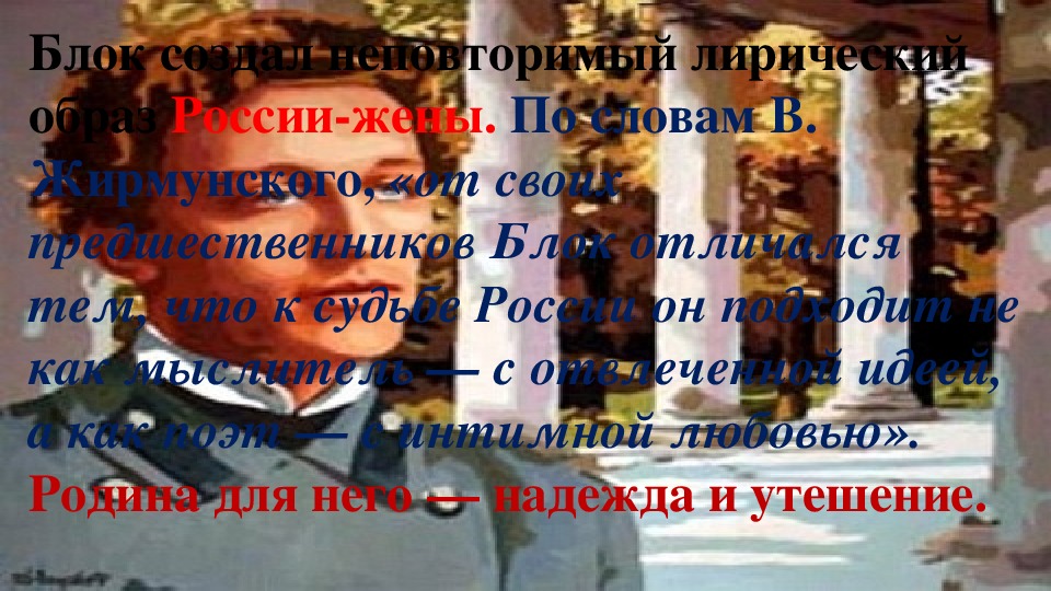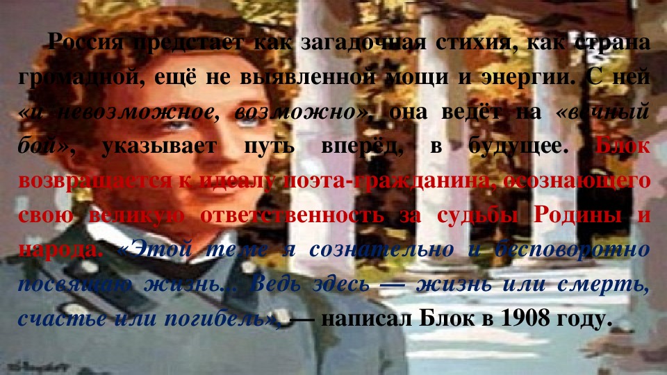 В 1911—1912 гг. Блок переработал свои пять сборников в трёхтомное «Собрание стихотворений». Блок называл своё творчество процессом «вочеловечения». Трилогия «вочеловечения» отражает три этапа этого процесса. «Теза» первого с поклонением идеалу противопоставлена «антитезе» второго, с разгулом стихии реального мира и утратой идеала. На третьем этапе происходит «синтез» — обретение новых положительных ценностей. Собирательным образом всех утраченных ценностей становится Родина. Поэт охвачен тревогой за её судьбу, возвращает себе способность чувствовать.«Это все — о России» (Блок).